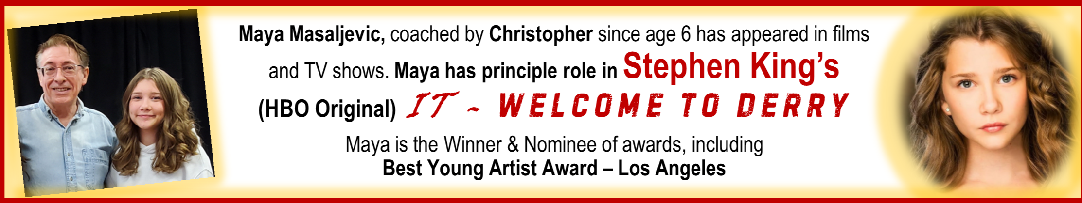 “Over the last 2 years, Chris has not only helped me develop my acting skills, but also instilled in me the confidence and professionalism needed in this industry.”